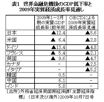 今回の大不況以後、今までに最も落ち込みが大きかった2009年1~3月期について、各国の実質成長率(前年同期比)を比較すると、日本は▲12.4%で、ドイツと並んで、落ち込みの大きさが際立っている。さらに、OECD(経済協力開発機構)の2009年実質経済成長率見通しによると、日本は▲5.6%で、先進7ヵ国中最も低い。(前掲した表1)