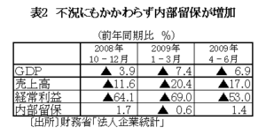 それを表すのが、今回の分析で明らかになった内部留保の異常な増加である。昨年来、経済危機の下にもかかわらず積み増しされてきた内部留保は、「派遣切り」「非正規切り」、さらには、正社員に対する希望退職などの、首切り・リストラをおこなうなかでため込んだものであり、そのような経営が、日本経済を、雇用の減少→賃金低下→内需縮小→国内生産縮小→雇用の減少という“負の悪循環”に追い込み、経済の落ち込みを加速している。