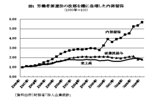 内部留保は、企業の生産活動によって新たに付け加えられた価値(「付加価値」≒GDP)の一部が、企業内部に滞留することを意味し、過度の増加は、国内需要の不足をひき起こして経済を不況に陥れることになる。
