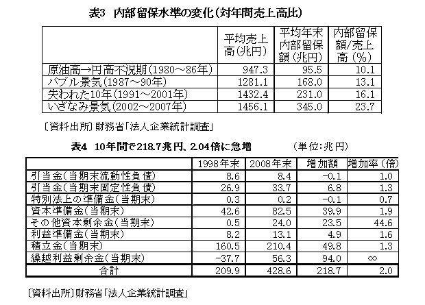 「法人企業統計」によると、売上高に対する内部留保の水準は、1970年頃の高度経済成長期には5%前後であったが、日本経済の不安定化に伴って徐々に上昇し、第2次石油危機から円高へと続いた1980~86年度には、平均10.1%になった。その後のバブル景気(1987~90年度)の時期は13.1%、バブル後の長期不況“失われた10年”(1991~2001年度)の時期は、平均16.1%であった。それが、いざなみ景気(正式名称は未定。2002~2007年)の時期に、23.7%に急上昇したのである。(表3)