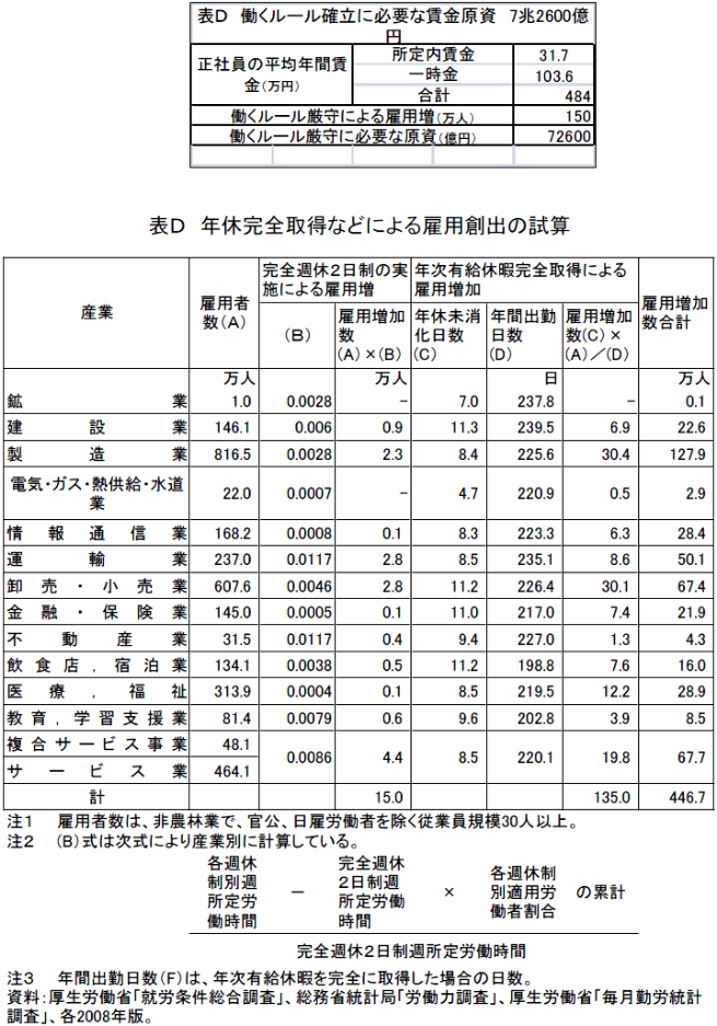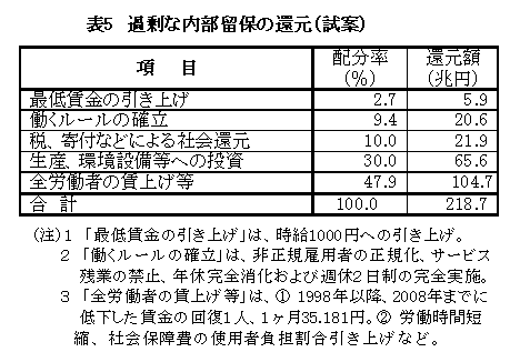 最低賃金を時給1000円に引き上げ、非正規雇用を正規雇用に代えることは、労働者に健康で文化的な最低限の生活を保障することである。また、サービス残業の禁止、週休2日制の完全実施、年次有給休暇の完全取得は、先進国の常識であり、当然、既に実現されていなければならない事項である。これらを実施しても、必要資金は26.5兆円であり、1998~2008年度の内部留保増分218.7兆円の12.1%にすぎない。