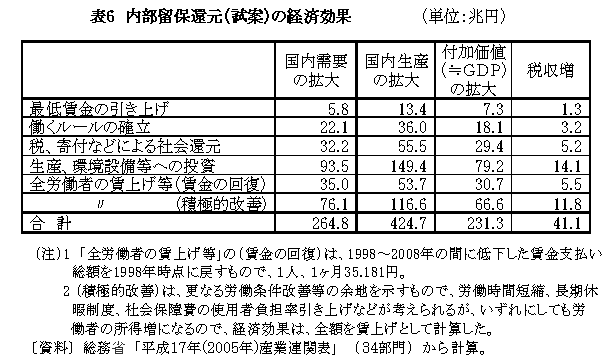 つまり、この間、目先の利益を追って内部留保の拡大に走るのではなく、表5のような内容で利益を労働者・社会に適正に配分していれば、これだけの経済効果が発生し、現在のような不況には陥らなかったと思われる(表6)