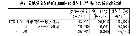 労働総研と全労連、首都圏の労働組合が行った「首都圏最低生計費試算報告」によれば、必要な最低生計費は年間280万円である。最低賃金を時給1000円に引き上げても、現在それを下回っている労働者の賃金が、一般労働者で年間249万円、パート労働者の場合は、年間114万円になるだけであり、一般労働者でも自分一人のギリギリの生活が保障されるだけである。パートの場合には、「最低の生計費」に遠く及ばない。(表7)