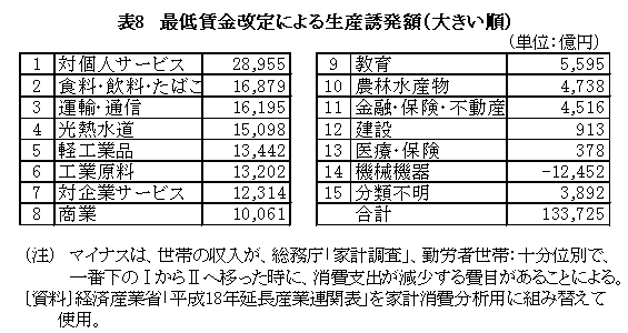 また、産業連関分析により、最低賃金引き上げに伴う消費増が、どのような商品・サービスの生産を多く誘発するか調べてみると、娯楽、理美容等の「対個人サービス」、「食料・飲料・たばこ」、「運輸・通信」、紙や繊維製品等の「軽工業品」など、中小企業が多い分野の商品・サービスを誘発する。したがって、最低賃金の引き上げは、中小企業の経営に良い影響を及ぼすと考えられる。(表8)