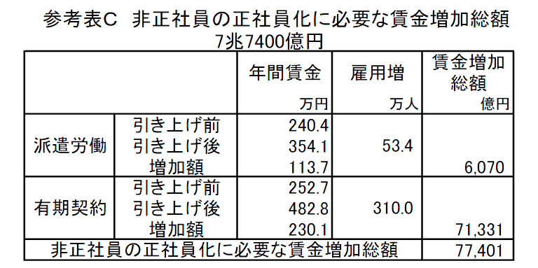 有期契約労働者の正規化の人数は310万人とした。厚生労働省「有期契約労働者の雇用管理の改善に関する研究会報告」(2008年7月)で、「1週間の所定内労働時間が通常の労働者と同一な有期契約労働者が310万人に上る」としていることから、そのデータを採用することにした。